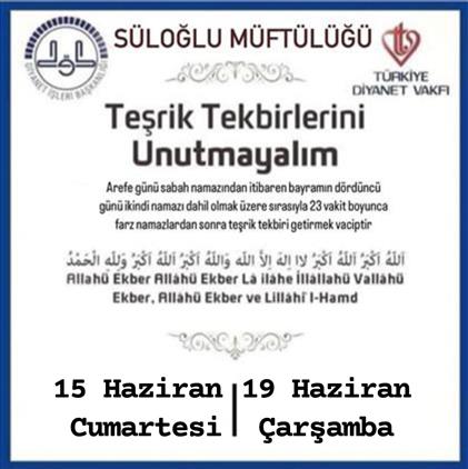 Vâcip olan Teşrik Tekbirleri Arefe günü sabah namazıyla birlikte başlayıp Kurban Bayramı’nın 4.Günü ikindi namazıyla sona erer.