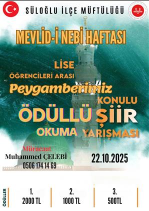 İlçe Müftülüğümüz tarafından 22 Ekim 2025' tarihinde lise öğrencileri arasında “Peygamberimiz” konulu ödüllü şiir okuma yarışması düzenlenecektir